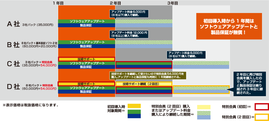 月額で換算すると月々4,500円(税抜)で、技術サポートとソフトの無償アップデート、製品保証の延長が受けられます。